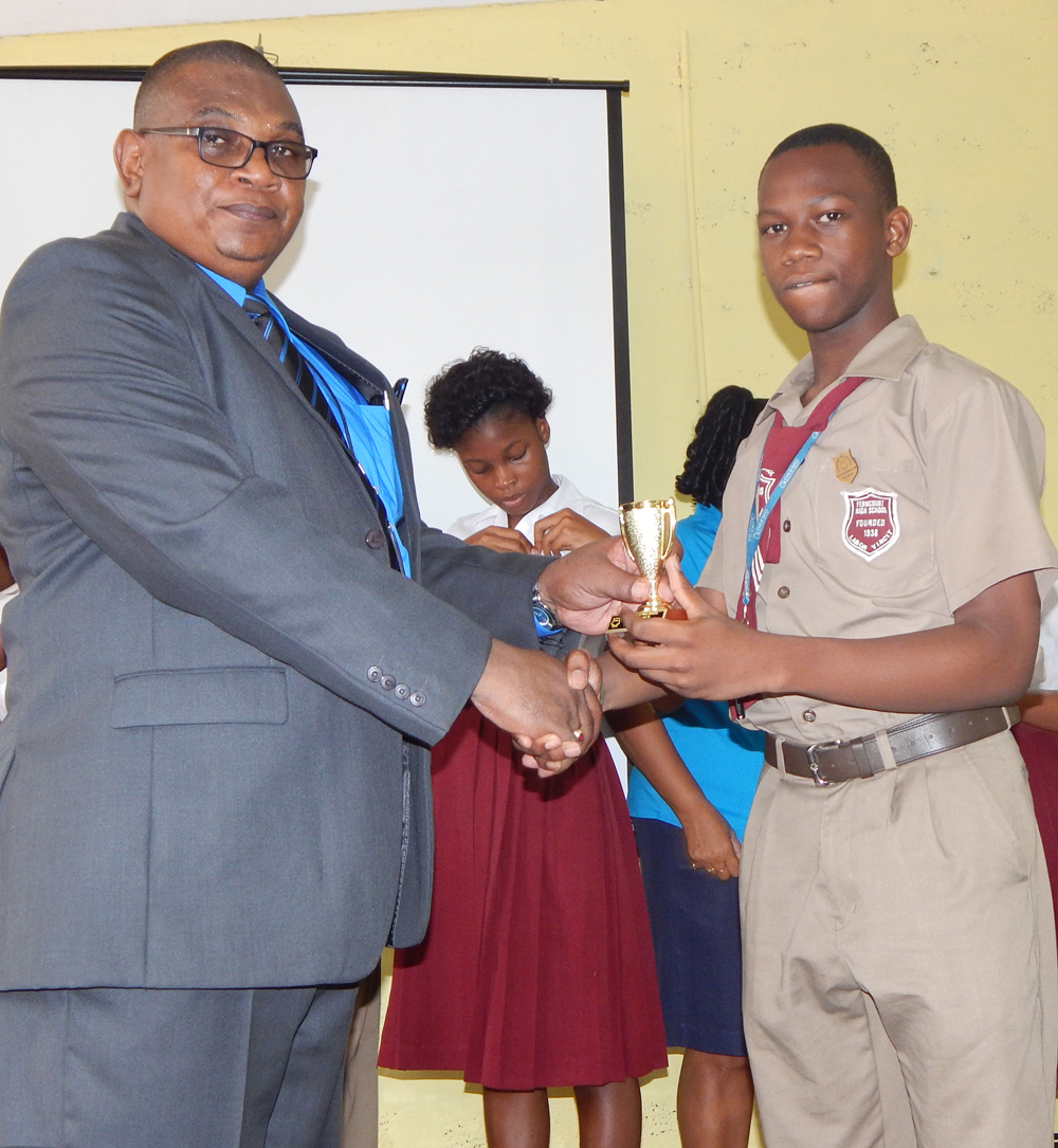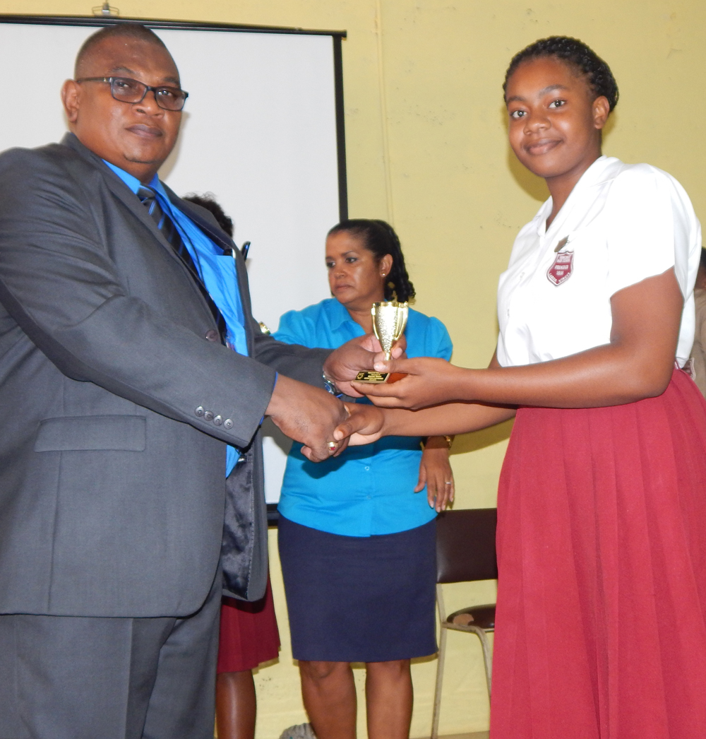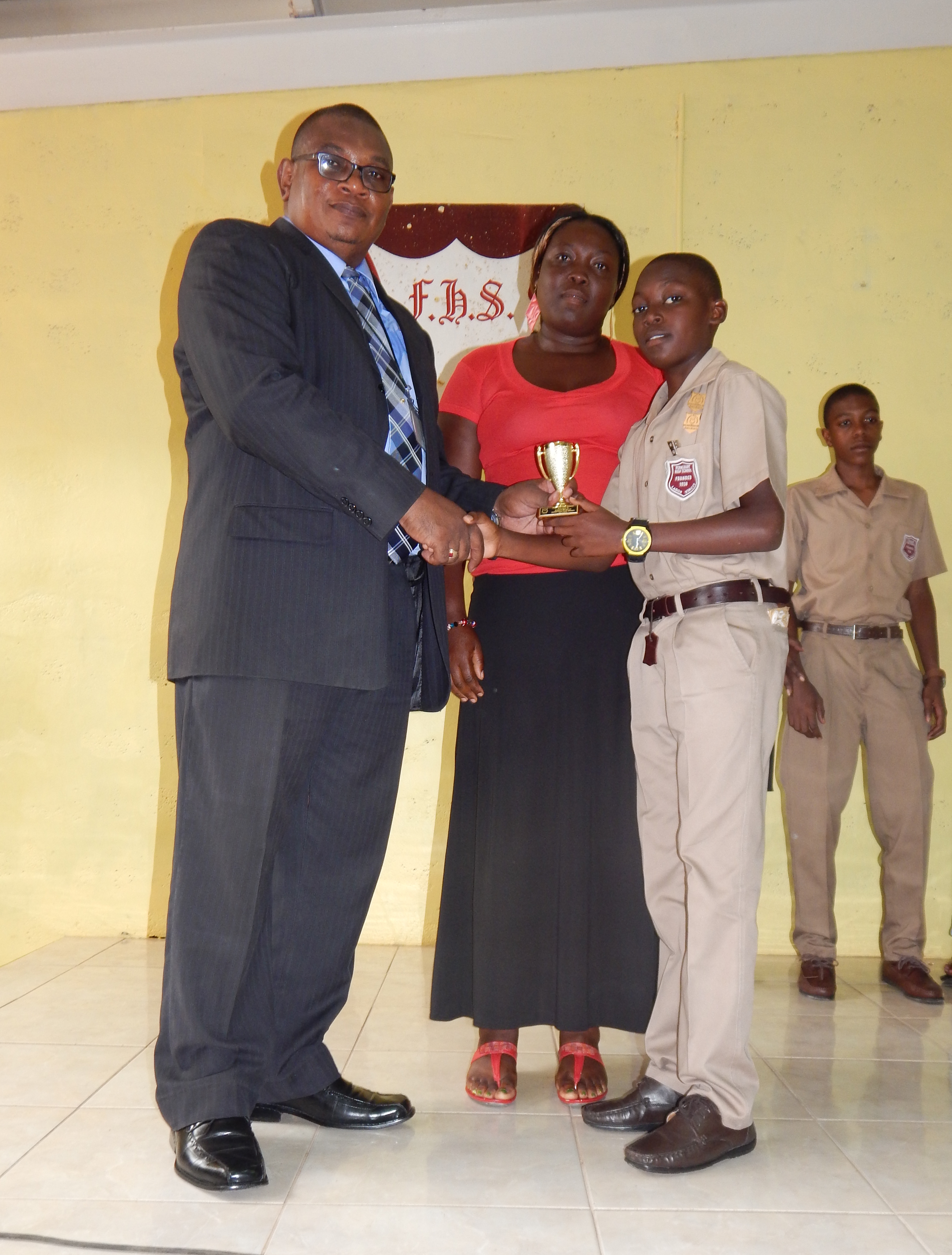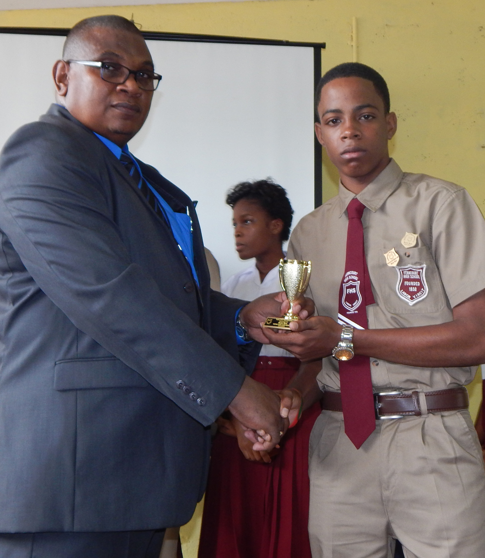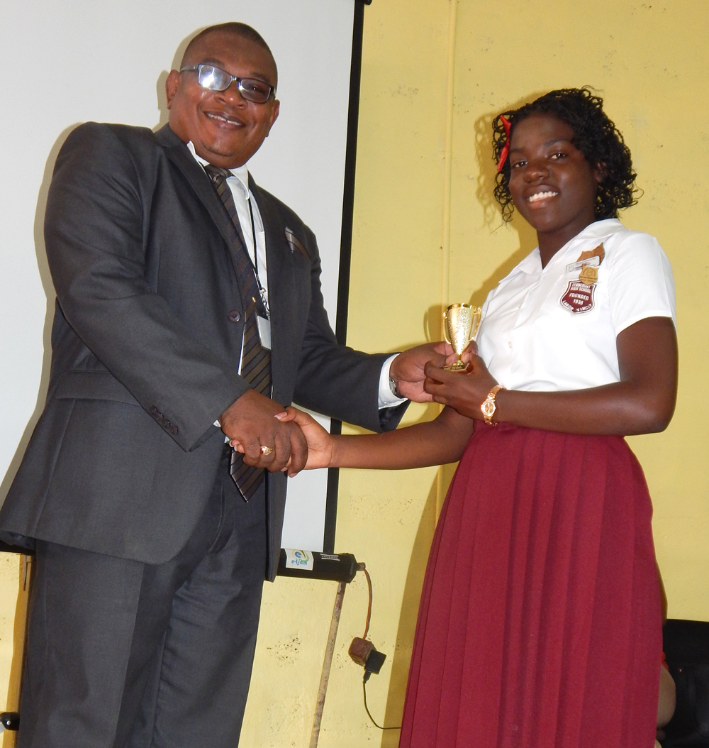 Ferncourt High School embarked on a wave of excellence at its Back-to-School Conference during the week of August 17-21, 2015.The principal of Ferncourt High School, Rev’d Lenworth Sterling and his team of his hardworking teachers began the new school year by highlighting students who displayed outstanding performance in academics in the previous school year in both the internal and external examinations.Students who are members of the Principal’ Distinction Club and those on the Honor Roll as well who sat CSEC as members of the Academic Accelerated Programme were in for recognition by the principal. These students’ performance range from 70% and over in internal examinations to students receiving grades 1-3 in the CSEC Examinations. Students received Gold and Blue Cards, Badges of Distinction and trophies.No Back-to-School Conference is complete without the principal welcoming all the new students, especially the grade 7 students. Top performing GSAT students in the different subject areas were recognized and awarded. Jamie Gray coming from the Claremont All-Age School was the Top Student entering the Grade 7 Programme and was given a scholarship which will pay his school fees for the duration of his five years at the school. Other students receiving scholarships for the five years were Khaeme Rattigan, Matthew Beckford and Deneika Traille. These scholarships were offered by Past Student, Dr. Judith Johnson from the Class of 1976 and Mr. Clive E. Waugh, Executive Director of The Hixroy & Hazel Waugh Scholarship Fund.The principal outlined the school’s plans for the year 2015/2016 in Academics, Students’ and Staff welfare and Students’ Social Development. He also praised the teachers in their achievements in 2014/2015 especially in Mathematics, English A and Spanish. The School’s Theme for the year is “If you want to be the BEST, you must beat the best.”