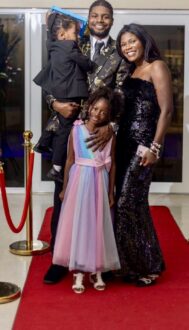 (Karlene’s children and grandchildren on the red carpet – Son, Jordan, with Jhus in arm, daughter Jewelle at right, and Jolene standing.