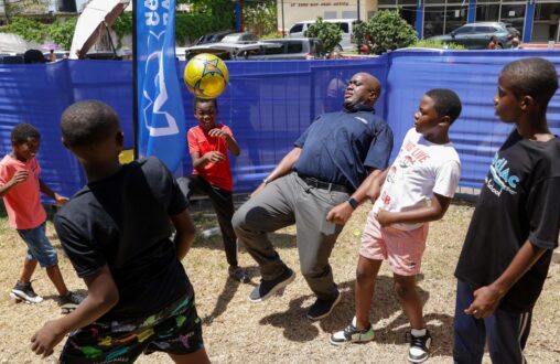 (Kevin Ingram, Head of Branch Sales at NCB, joins the fun in the Kids’ Zone with a display of football skills)