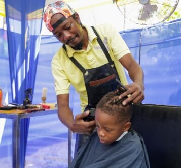 (Tahjari Taffi, four-year-old student from Lime Hall Infant Primary & Infant School, gets a dapper fade from local entrepreneur Mark Thomas, owner of StarsCut Barbershop, at the NCB Back-to-School Fair at its St Ann’s Bay branch.)