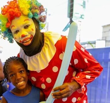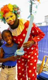 (Janele Bryan, seven-year-old Priory Primary & Infant School student, is all smiles as she receives her balloon from Recondo ‘Too Sweet the Clown’ Duhaney at the NCB Sum’n Nice fi Dem Future Back-to-School Fair in St Ann’s Bay.)