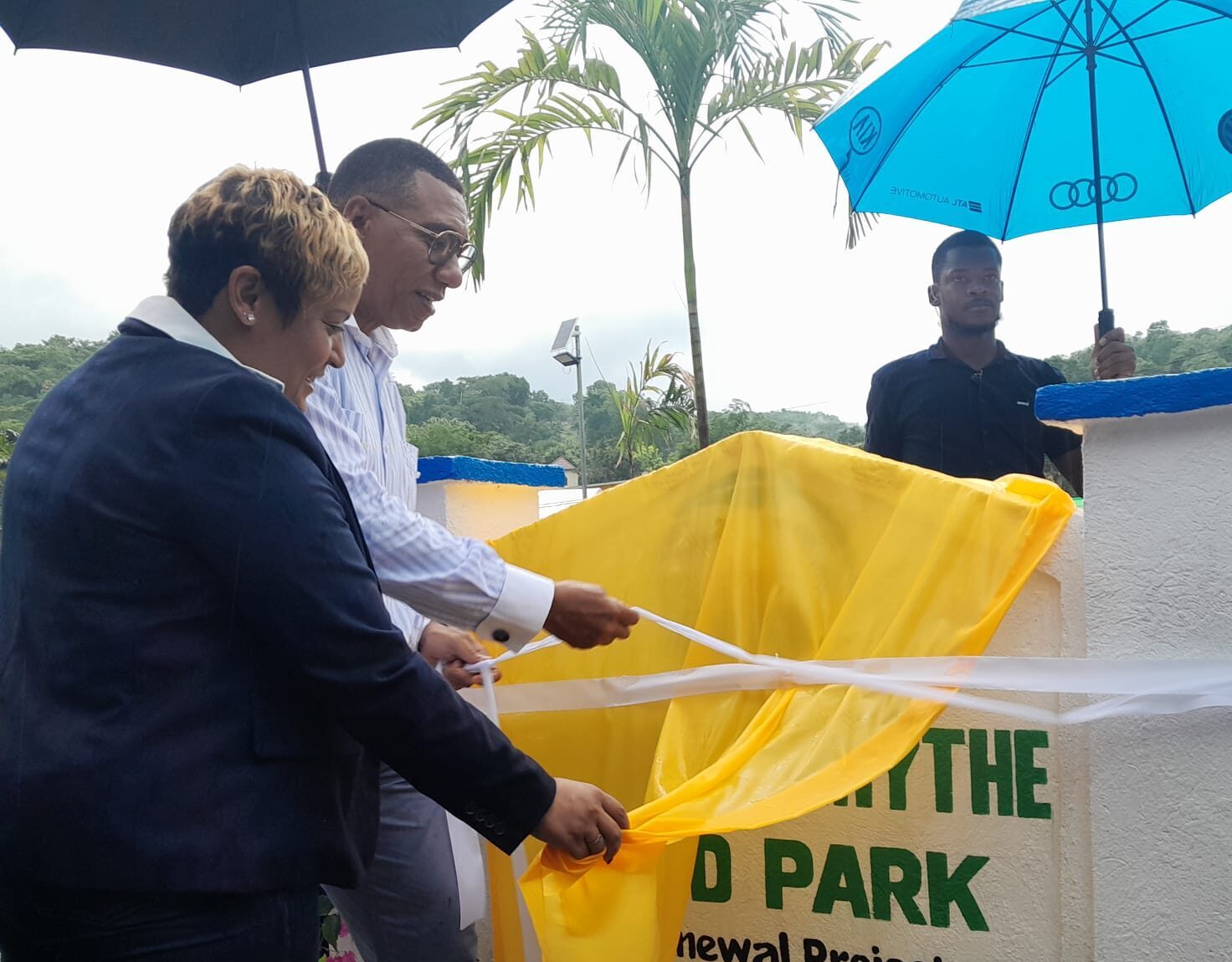 Prime Minister Andrew Holness, assisted by Member of Parliament for North West St Ann Krystal Lee unveiled the sign at the entrance to the park on Friday, October 11, 2025, during pouring rain