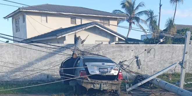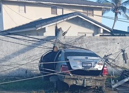 The four assailants, three of them from Trelawny, jumped into their car and fled the scene. However, just over a half mile away along the main road going west, their car crashed, slamming into two light poles, close to the Cardiff Hall and near the police station at Runaway Bay Cross Roads.