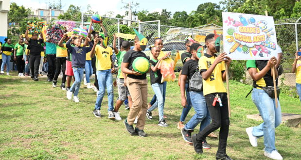 (Students in the national colours, participate in a parade showcasing Jamaica’s immense global impact through music, athletics, and cultural achievement, during Jamaica Day celebrations at Steer Town Primary and Infant School.)